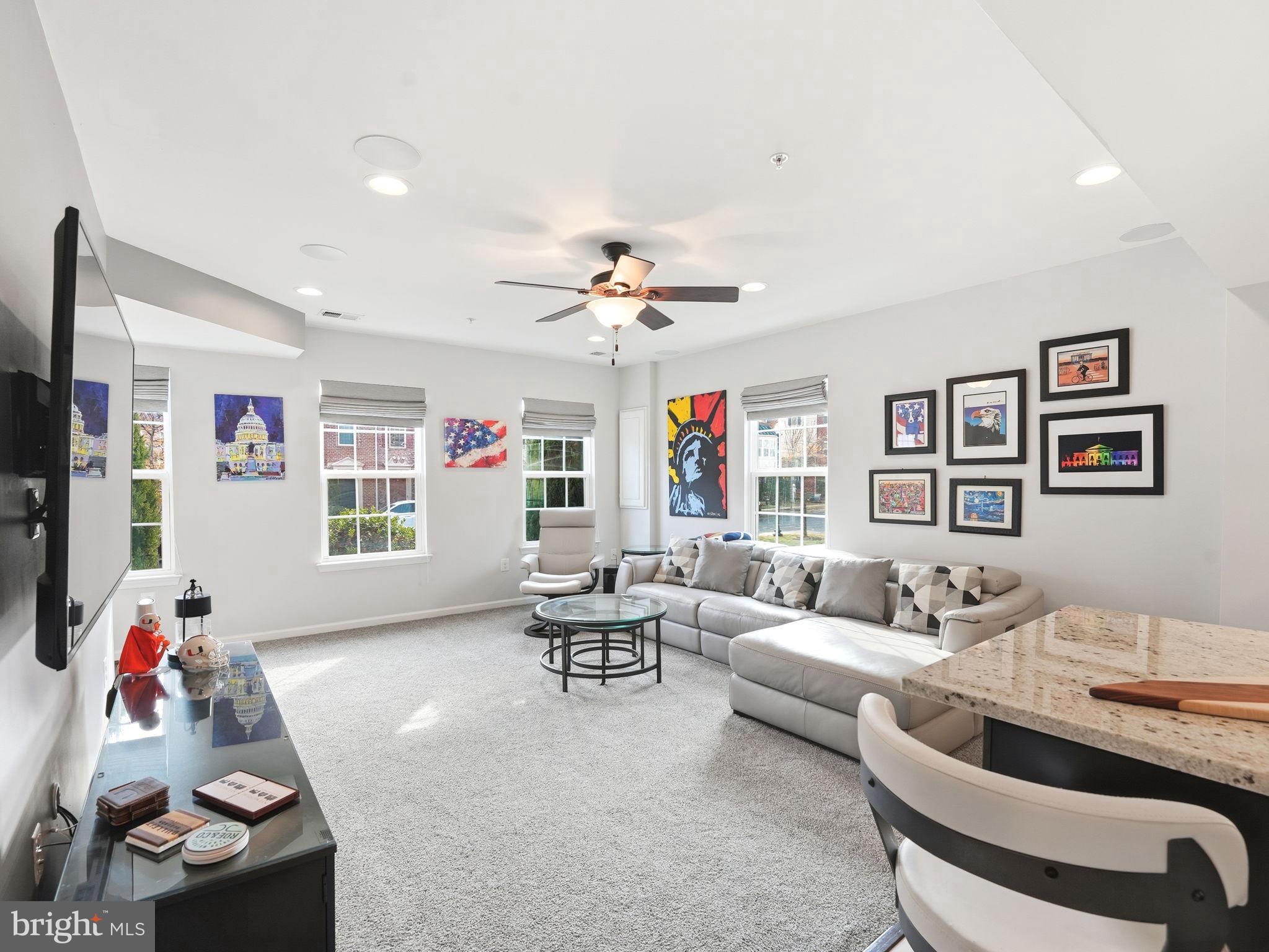 The main floor offers engineered hickory wood flooring, a bright living room with a front bump-out, custom Roman shades, and five END-UNIT WINDOWS for abundant natural light. The family room includes built-in glass shelving, a display nook, in-ceiling stereo speakers, in-wall TV wiring, recessed lighting, and an EXTENDED MORNING ROOM. The gourmet kitchen features stainless steel appliances, double oven, modern ceramic backsplash, recessed and pendant lighting with dimmers, and under-cabinet lighting with remote. Entertain or relax on your PRIVATE REAR DECK with an 18' POWERED SUNSETTER AWNING and serene views of Fort Lincoln Park.